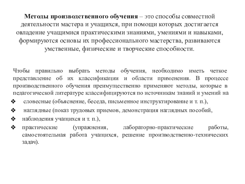 Чтобы правильно выбрать методы обучения, необходимо иметь четкое представление об их классификации и области применения. В процессе производственного обучения преимущественно применяют методы, которые в педагогической литературе классифицируются по источникам знаний и умений на