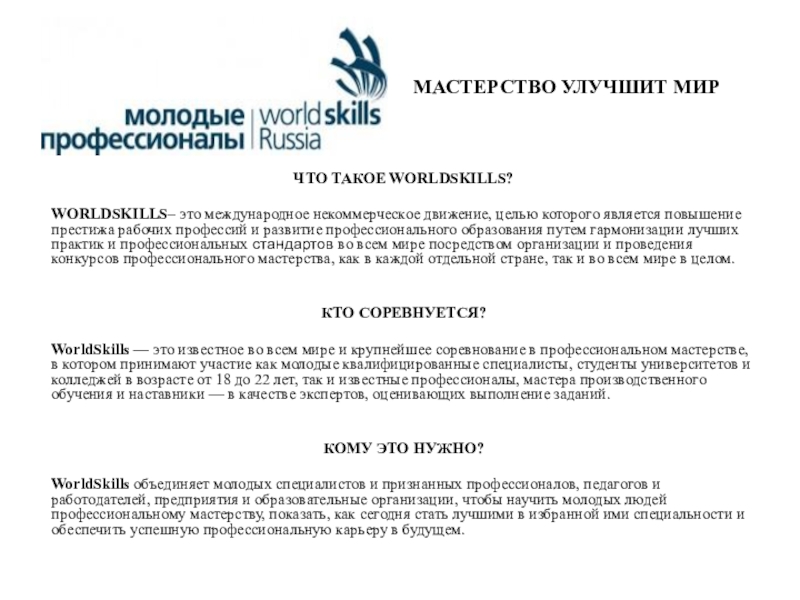 WorldSkills объединяет молодых специалистов и признанных профессионалов, педагогов и работодателей, предприятия и образовательные организации, чтобы научить молодых людей профессиональному мастерству, показать, как сегодня стать лучшими в избранной ими специальности и обеспечить успешную профессиональную карьеру в будущем.