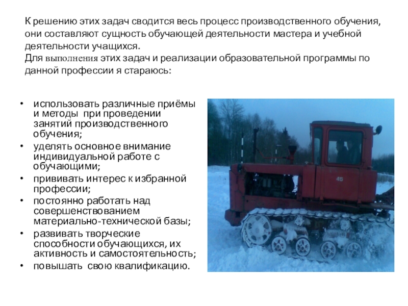 подготовить обучающихся по профессии «Тракторист-машинист с/х производства» так, чтобы они были конкурентоспособными на рынке труда и отвечали современным требованиям с/х производства;