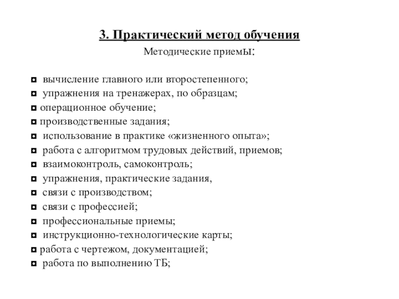 Важнейшими для производственного обучения являются практические методы. Это основные методы формирования умений и навыков учащихся. Поэтому мастеру для успешного руководства производственным обучением нужно, глубоко знать их дидактические возможности.