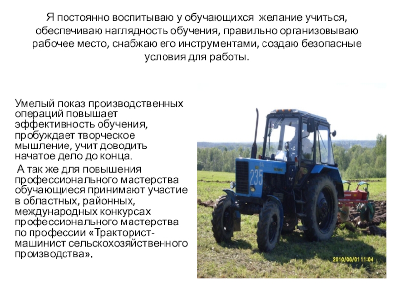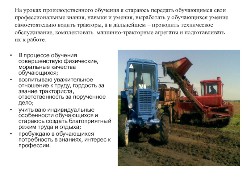 воспитываю уважительное отношение к труду, гордость за звание тракториста, ответственность за порученное дело;