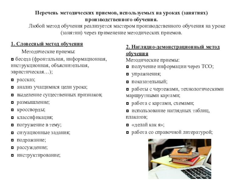 Слайд 8Перечень методических приемов, используемых на уроках (занятиях) производственного обучения.