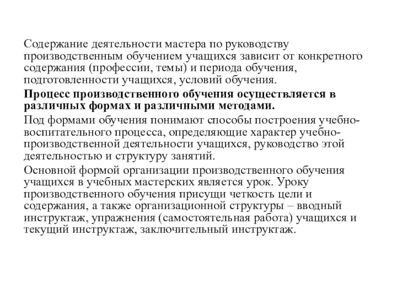 Слайд 5Содержание деятельности мастера по руководству производственным обучением учащихся зависит от конкретного