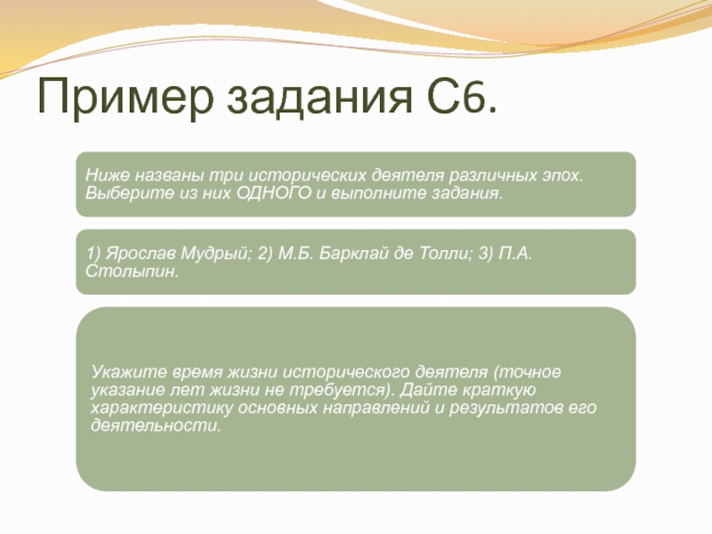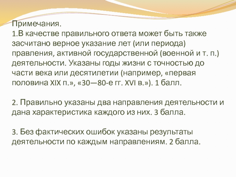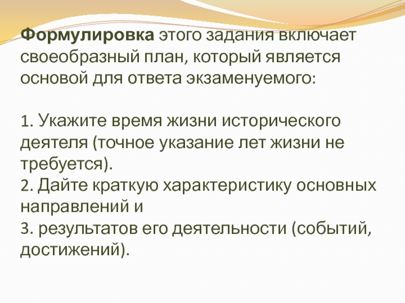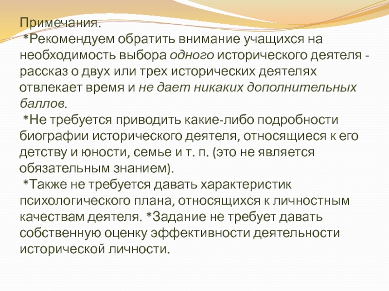 *Также не требуется давать характеристик психологического плана, относящихся к личностным качествам деятеля. *Задание не требует давать собственную оценку эффективности деятельности исторической личности.