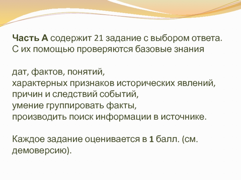 Слайд 14Часть А содержит 21 задание с выбором ответа. С их