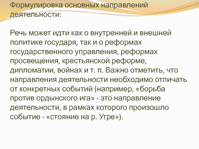 реформах просвещения, крестьянской реформе, дипломатии, войнах и т. п. Важно отметить, что направления деятельности необходимо отличать от конкретных событий (например, «борьба против ордынского ига» - это направление деятельности, в рамках которого произошло событие - «стояние на р. Угре»).