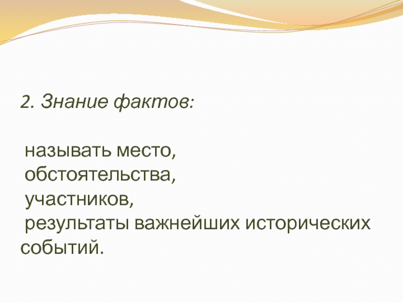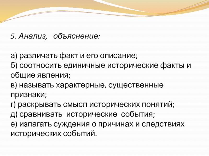 фактами могут быть войны, сражения, реформы, государственные документы, произведения искусства, научные открытия и др.), использование необходимых терминов, раскрытие причинно-следственных, пространственных, временных связей.