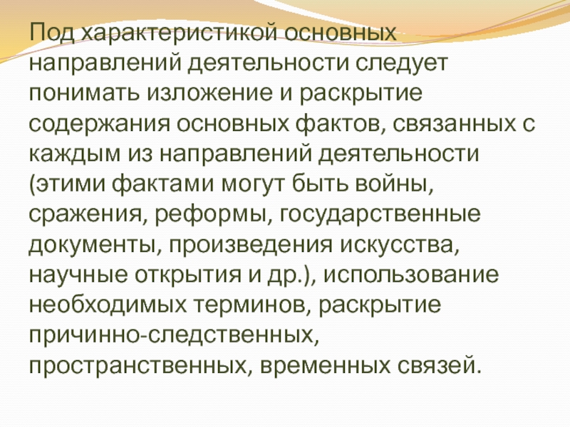 Слайд 35Под характеристикой основных направлений деятельности следует понимать изложение и раскрытие