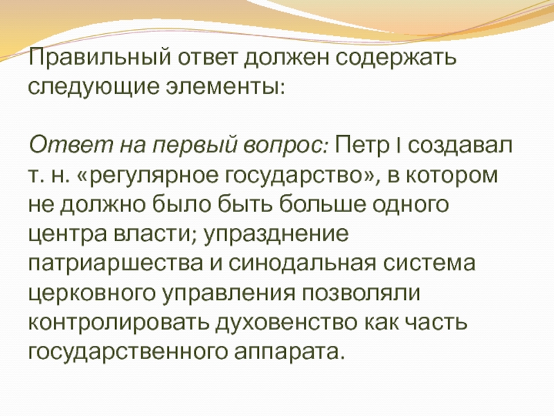 было быть больше одного центра власти; упразднение патриаршества и синодальная система церковного управления позволяли контролировать духовенство как часть государственного аппарата.
