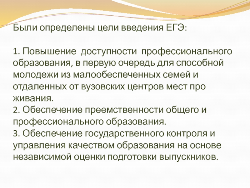 Слайд 3Были определены цели введения ЕГЭ: