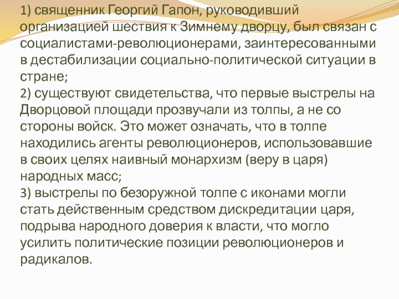 2) существуют свидетельства, что первые выстрелы на Дворцовой площади прозвучали из толпы, а не со стороны войск. Это может означать, что в толпе находились агенты революционеров, использовавшие в своих целях наивный монархизм (веру в царя) народных масс;