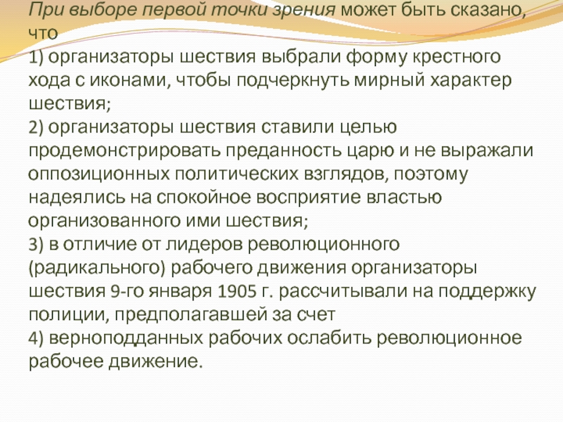 2) организаторы шествия ставили целью продемонстрировать преданность царю и не выражали оппозиционных политических взглядов, поэтому надеялись на спокойное восприятие властью организованного ими шествия;