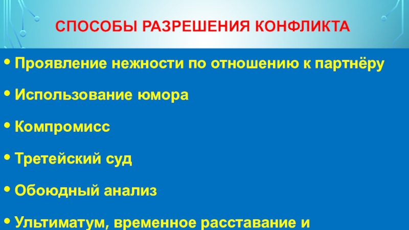 Способы разрешения конфликта Проявление нежности по отношению к партнёру Использование юмора Компромисс Третейский суд Обоюдный анализ Ультиматум,