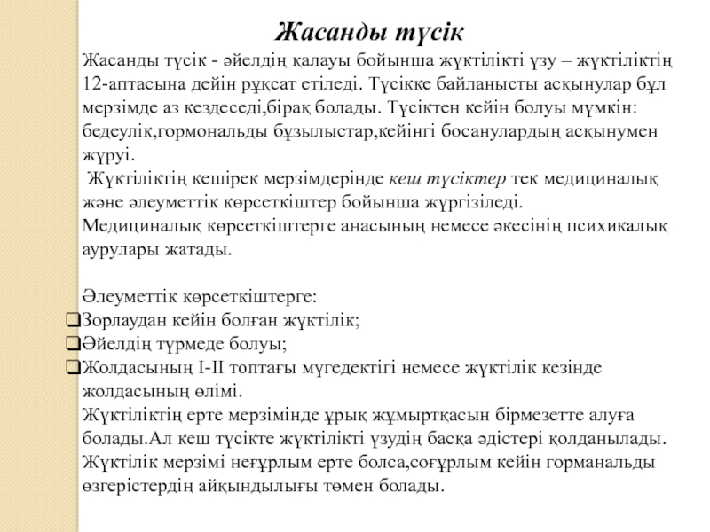 бойынша жүктілікті үзу – жүктіліктің 12-аптасына дейін рұқсат етіледі. Түсікке байланысты асқынулар бұл мерзімде аз кездеседі,бірақ болады. Түсіктен кейін болуы мүмкін:бедеулік,гормональды бұзылыстар,кейінгі босанулардың асқынумен жүруі.