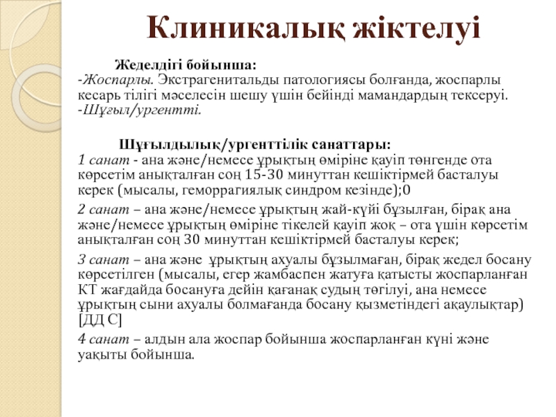 2 санат – ана және/немесе ұрықтың жай-күйі бұзылған, бірақ ана және/немесе ұрықтың өміріне тікелей қауіп жоқ – ота үшін көрсетім анықталған соң 30 минуттан кешіктірмей басталуы керек;