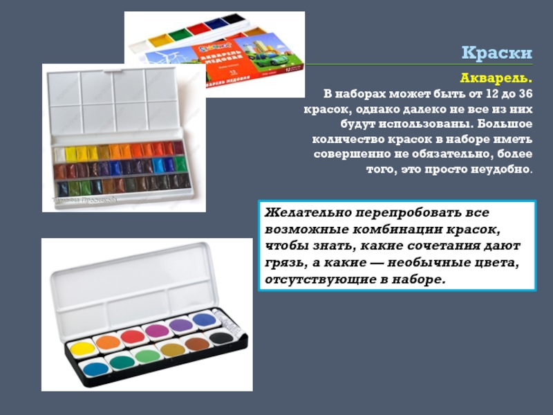Желательно перепробовать все возможные комбинации красок, чтобы знать, какие сочетания дают грязь, а какие — необычные цвета, отсутствующие в наборе.
