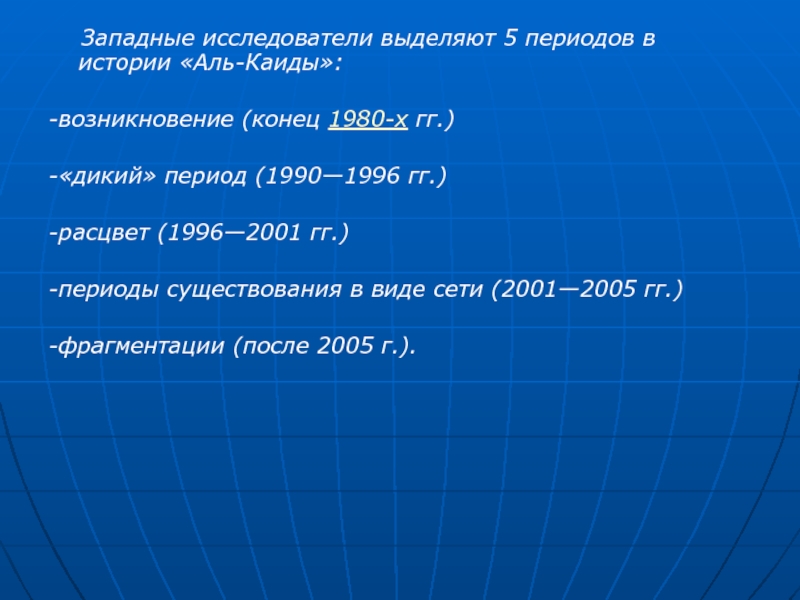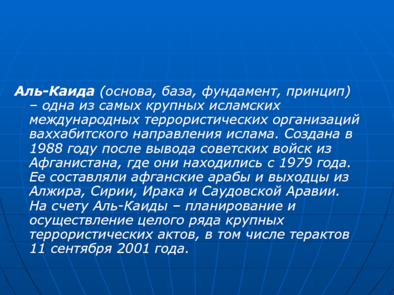 году после вывода советских войск из Афганистана, где они находились с 1979 года. Ее составляли афганские арабы и выходцы из Алжира, Сирии, Ирака и Саудовской Аравии. На счету Аль-Каиды – планирование и осуществление целого ряда крупных террористических актов, в том числе терактов 11 сентября 2001 года.