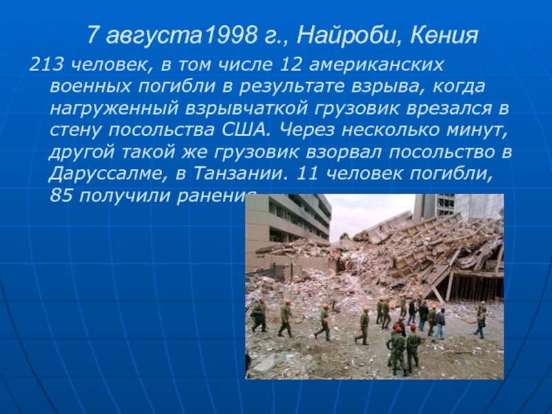 врезался в стену посольства США. Через несколько минут, другой такой же грузовик взорвал посольство в Даруссалме, в Танзании. 11 человек погибли, 85 получили ранения