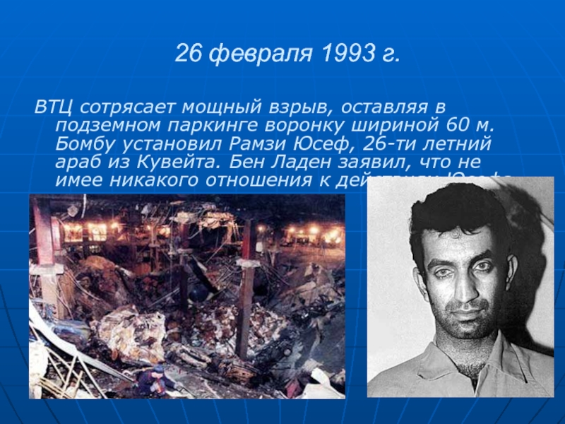 паркинге воронку шириной 60 м. Бомбу установил Рамзи Юсеф, 26-ти