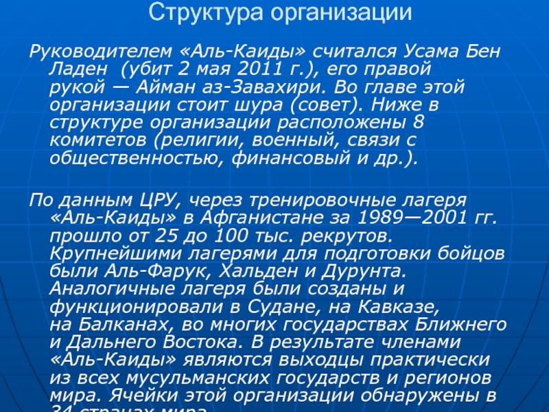 Слайд 3Аль-Каида (основа, база, фундамент, принцип) – одна из самых крупных