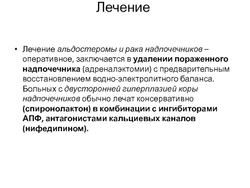 двусторонней гиперплазией коры надпочечников обычно лечат консервативно (спиронолактон) в комбинации с ингибиторами АПФ, антагонистами кальциевых каналов (нифедипином).