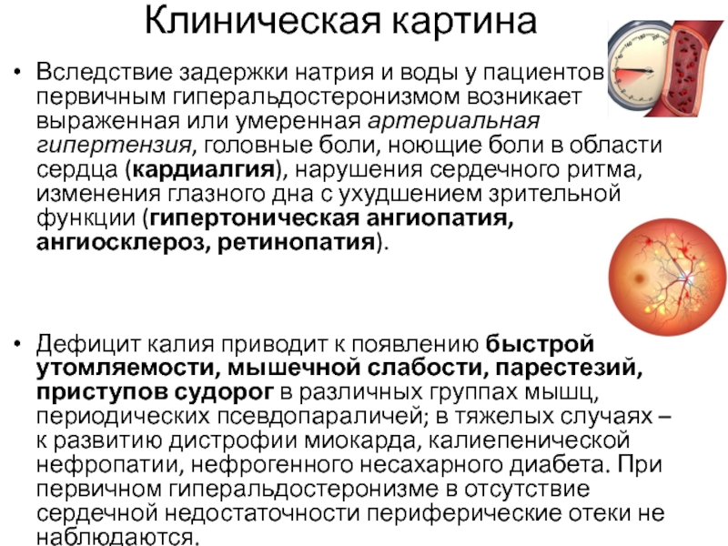 Дефицит калия приводит к появлению быстрой утомляемости, мышечной слабости, парестезий, приступов судорог в различных группах мышц, периодических псевдопараличей; в тяжелых случаях – к развитию дистрофии миокарда, калиепенической нефропатии, нефрогенного несахарного диабета. При первичном гиперальдостеронизме в отсутствие сердечной недостаточности периферические отеки не наблюдаются.