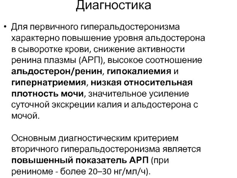 Основным диагностическим критерием вторичного гиперальдостеронизма является повышенный показатель АРП (при рениноме - более 20–30 нг/мл/ч).