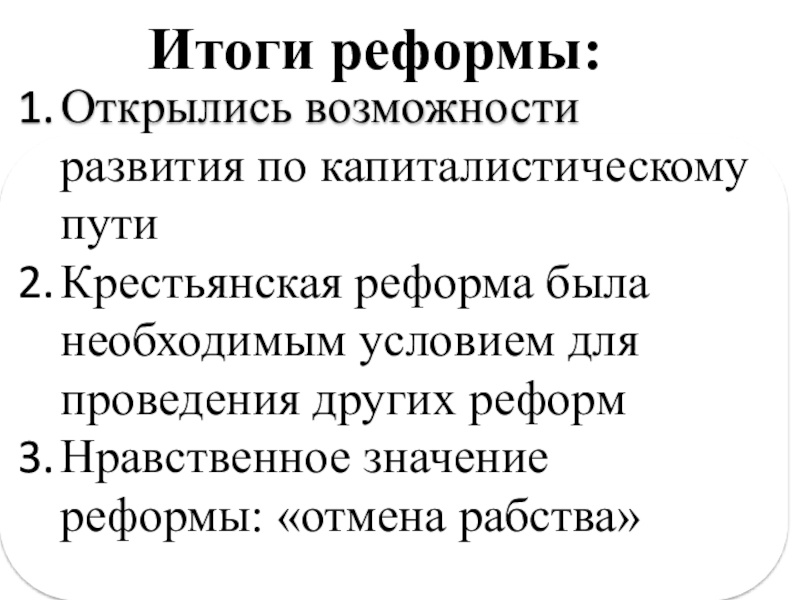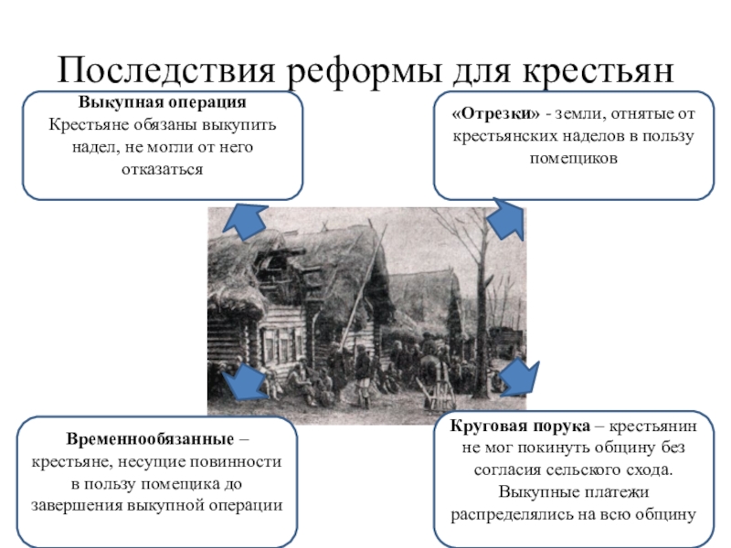 Круговая порука – крестьянин не мог покинуть общину без согласия сельского схода. Выкупные платежи распределялись на всю общину