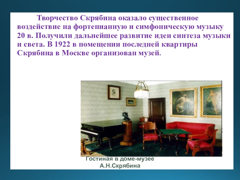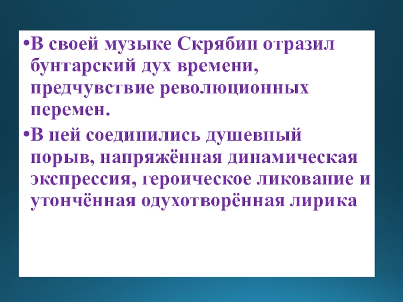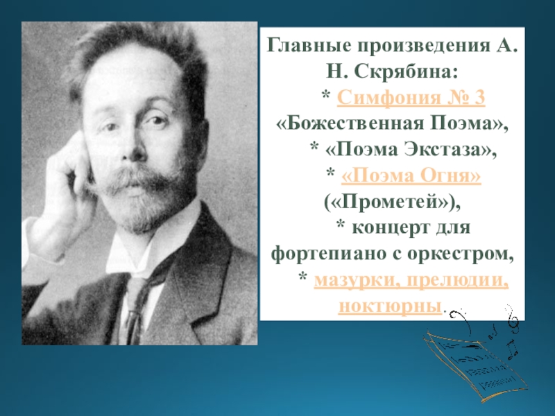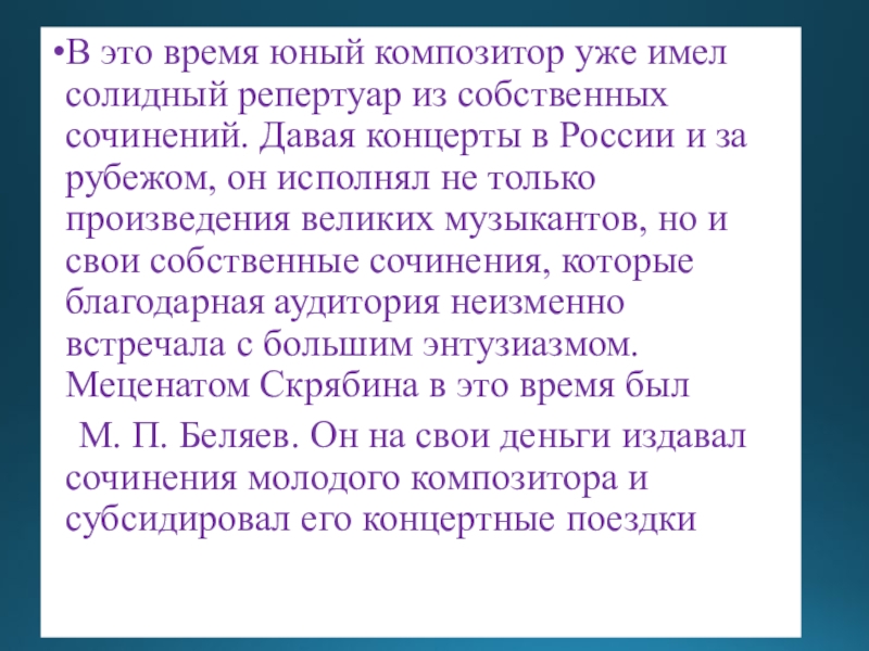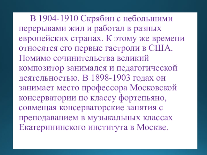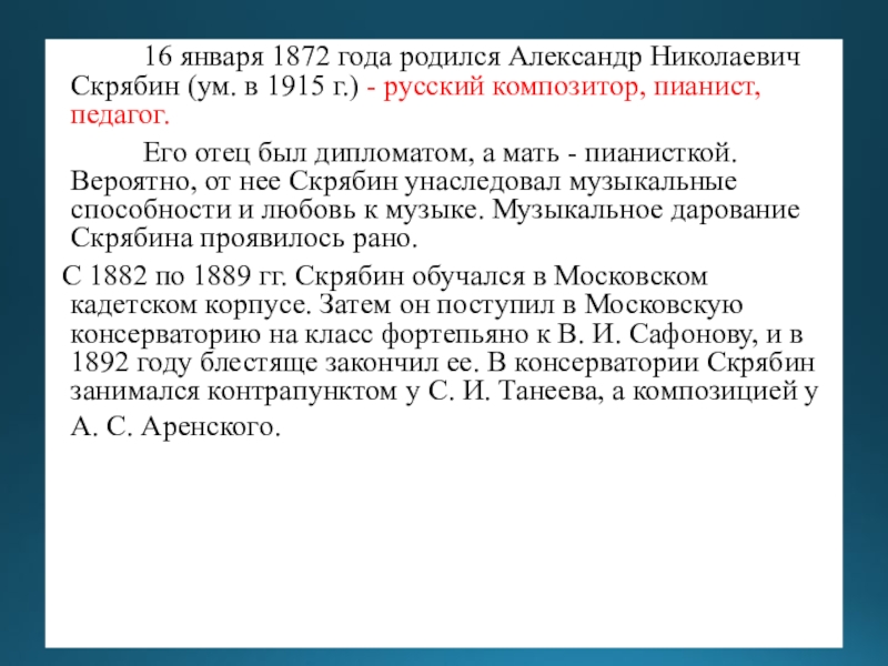 дипломатом, а мать - пианисткой. Вероятно, от нее Скрябин унаследовал музыкальные способности и любовь к музыке. Музыкальное дарование Скрябинa проявилось рано.С 1882 по 1889 гг. Скрябин обучался в Московском кадетском корпусе. Затем он поступил в Московскую консерваторию на класс фортепьяно к В. И. Сафонову, и в 1892 году блестяще закончил ее. В консерватории Скрябин занимался контрапунктом у С. И. Танеева, а композицией у А. С. Аренского.
