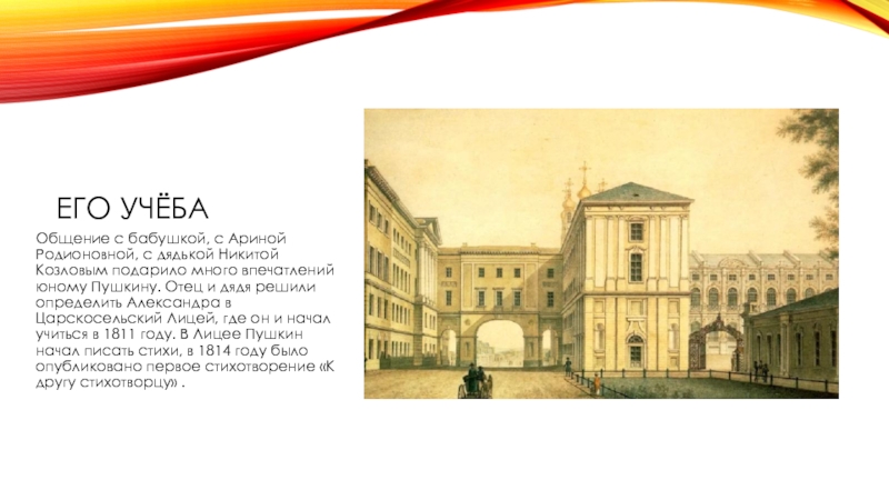 Его учёбаОбщение с бабушкой, с Ариной Родионовной, с дядькой Никитой Козловым подарило много впечатлений юному Пушкину. Отец