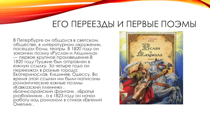 году он закончил поэму «Руслан и Людмила» — первое крупное произведение.В 1820 году Пушкин был отправлен в южную ссылку. За четыре года он переезжал в разные города: Екатеринослав, Кишинев, Одессу. Во время этой ссылки им были написаны романтические южные поэмы «Кавказский пленник» , «Бахчисарайский фонтан» , «Братья разбойники» , а в 1823 году он начал работу над романом в стихах «Евгений Онегин» .