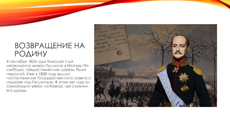 Возвращение на родину4 сентября 1826 года Николай 1-ый неожиданно вызвал Пушкина в Москву. Но свобода, предоставленная царем,