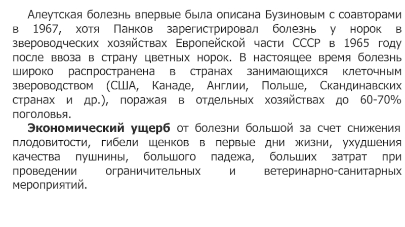 Слайд 3 Алеутская болезнь впервые была описана Бузиновым с соавторами в 1967,