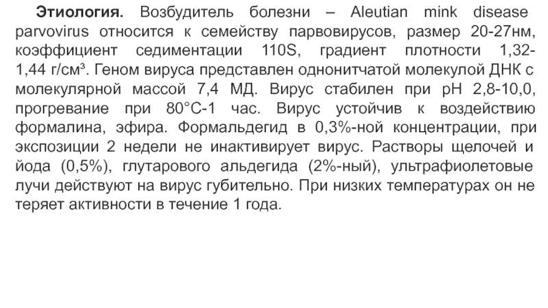 Слайд 4 Этиология. Возбудитель болезни – Aleutian mink disease parvovirus относится к