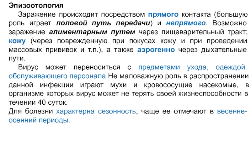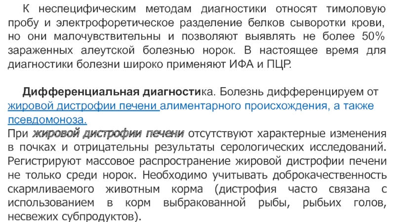 Слайд 9Для Алеутской болезни характерны стационарность и очаговость поражения отдельных ферм,