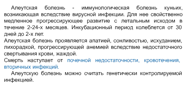 Слайд 5 Алеутская болезнь - иммунологическая болезнь куньих, возникающая вследствие вирусной инфекции.