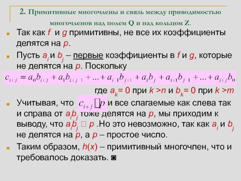 Слайд 412. Примитивные многочлены и связь между приводимостью многочленов над полем