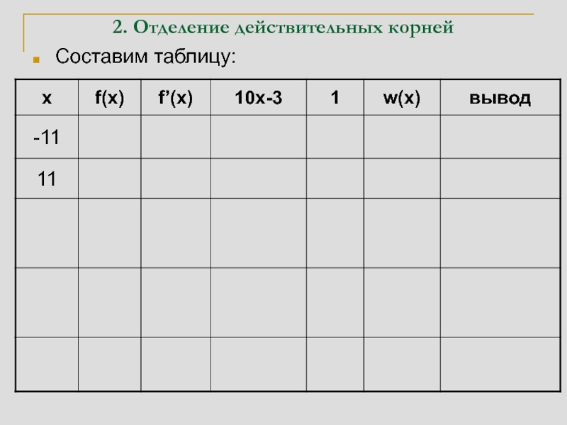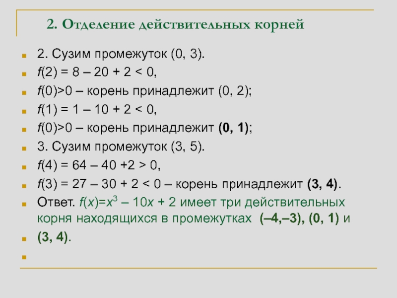 Ответ. f(x)=x3 – 10x + 2 имеет три действительных корня находящихся в промежутках (–4,–3), (0, 1) и