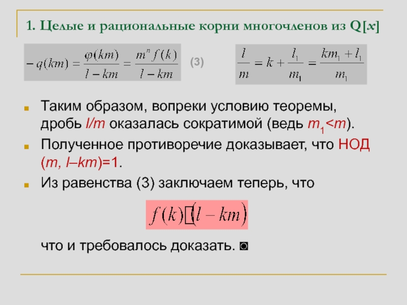 Слайд 33Таким образом, вопреки условию теоремы, дробь l/m оказалась сократимой (ведь
