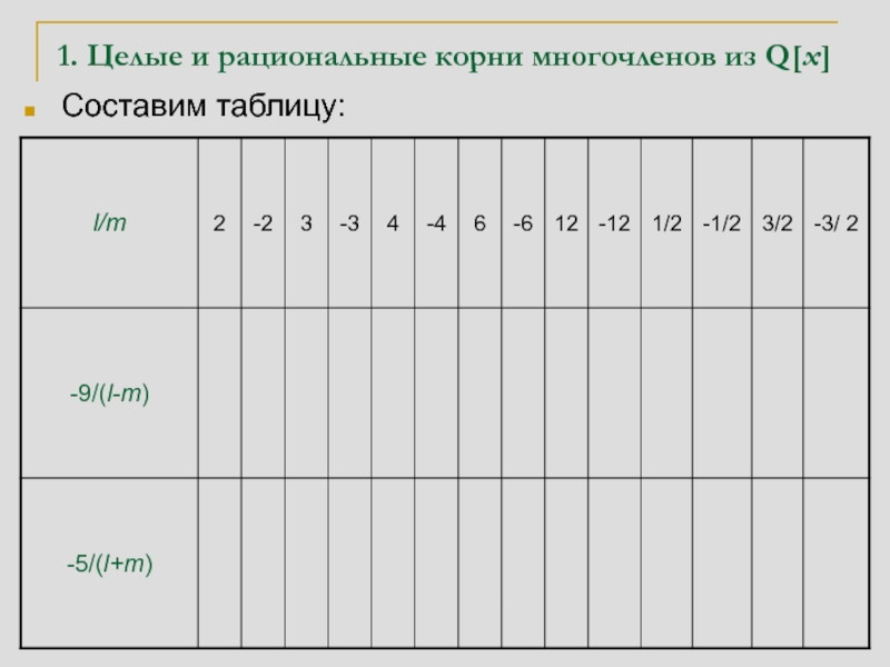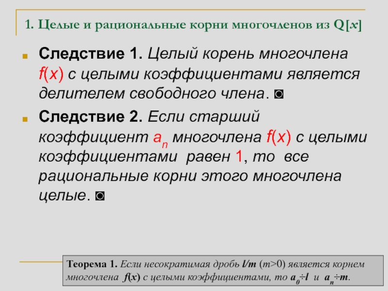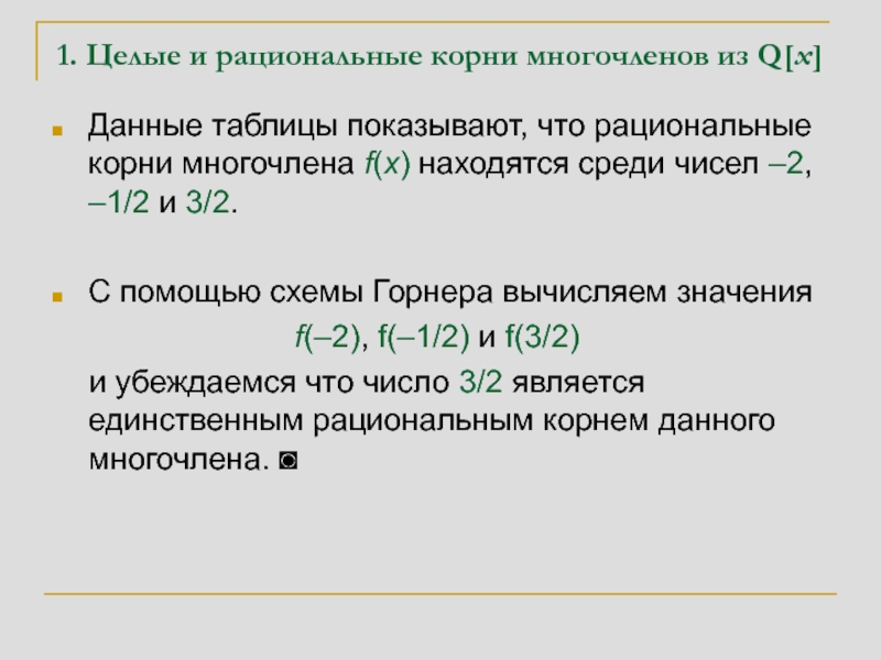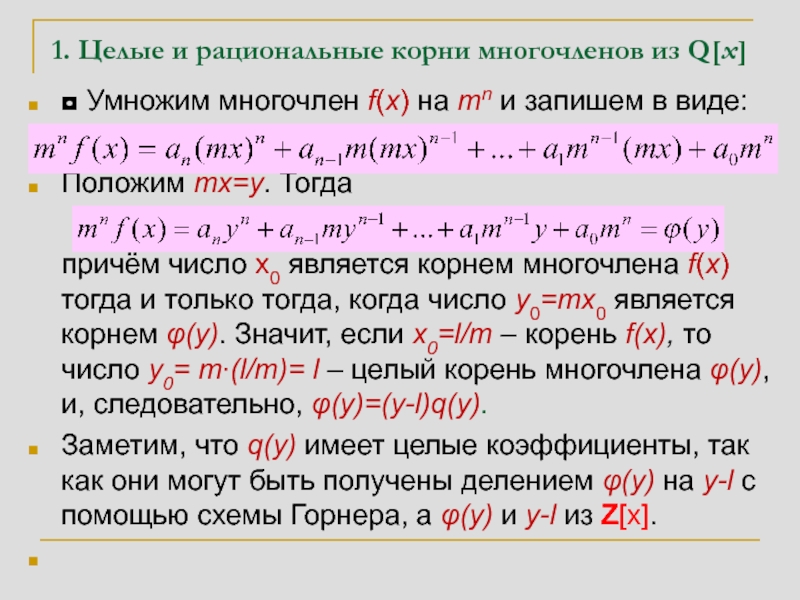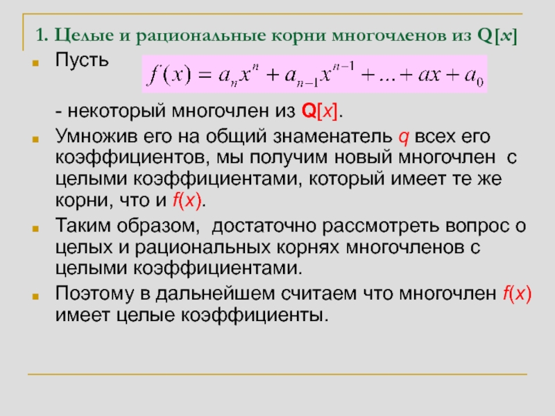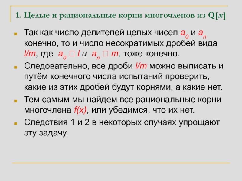 Слайд 401. Целые и рациональные корни многочленов из Q[x]