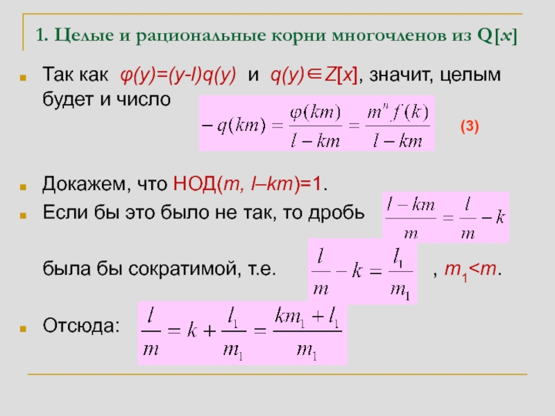 Слайд 32Так как φ(y)=(y-l)q(y) и q(y)Z[x], значит, целым будет и число