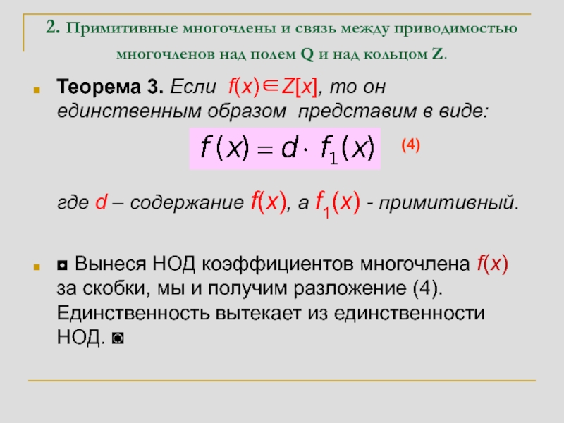 ◘ Вынеся НОД коэффициентов многочлена f(x) за скобки, мы и получим разложение (4). Единственность вытекает из единственности НОД. ◙