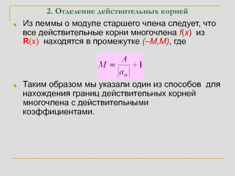 Таким образом мы указали один из способов для нахождения границ действительных корней многочлена с действительными коэффициентами.