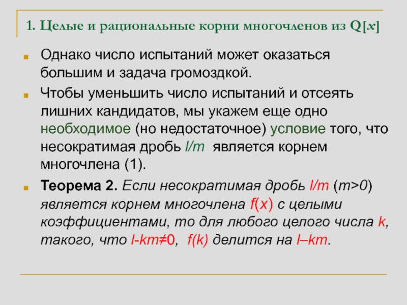 Слайд 26Теорема 1. Если несократимая дробь l/m (m>0) является корнем многочлена