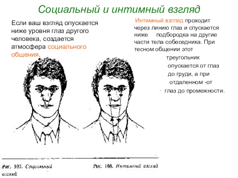 Интимный взгляд проходит через линию глаз и спускается ниже подбородка на другие части тела собеседника. При тесном общении этот