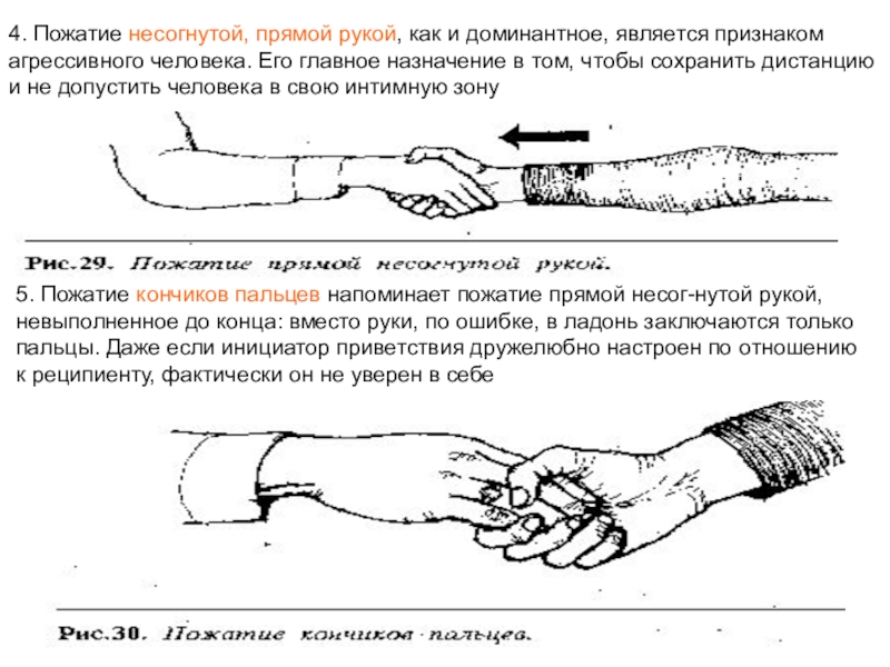 Слайд 414. Пожатие несогнутой, прямой рукой, как и доминантное, является признаком