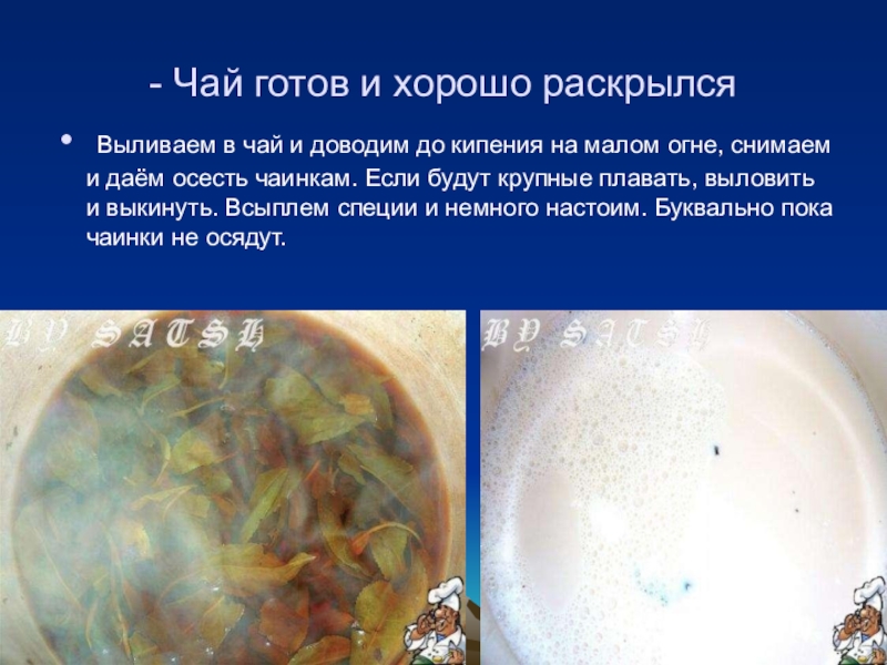 - Чай готов и хорошо раскрылся Выливаем в чай и доводим до кипения на малом огне, снимаем