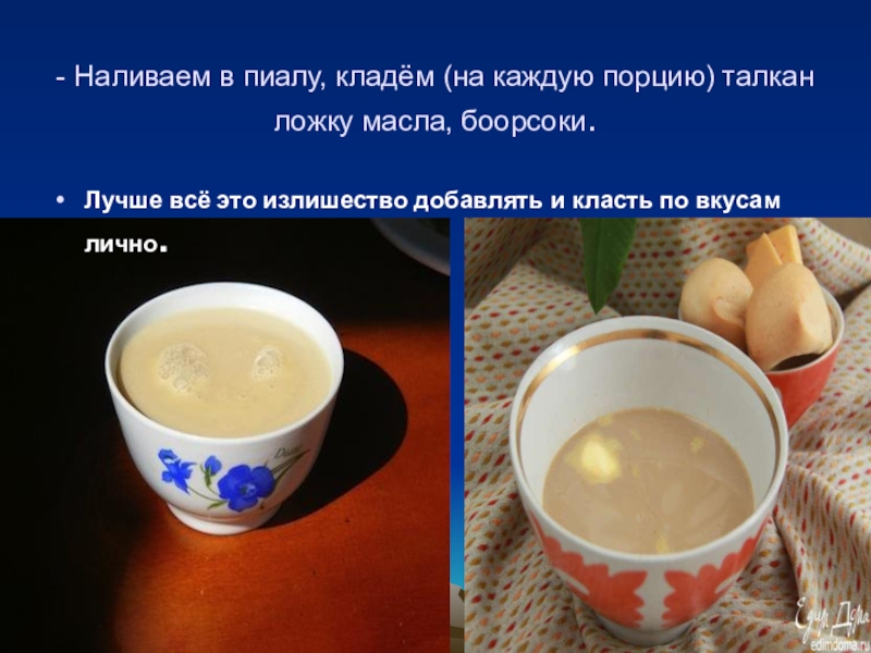Слайд 8- Наливаем в пиалу, кладём (на каждую порцию) талкан ложку