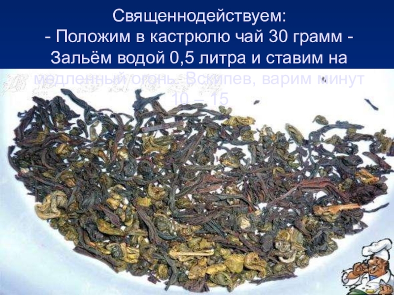 Слайд 5Священнодействуем: - Положим в кастрюлю чай 30 грамм - Зальём водой