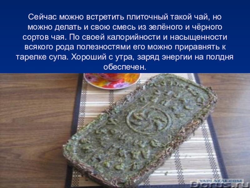 Слайд 4 Сейчас можно встретить плиточный такой чай, но можно делать и